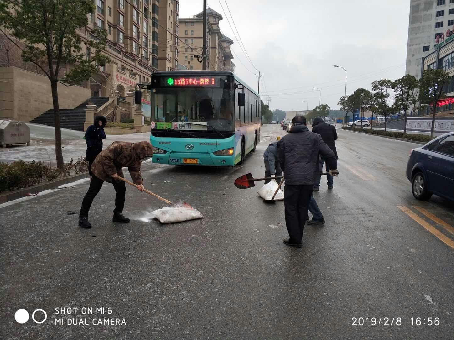 大年初四,降下風(fēng)雪,荊門公交集團(tuán)為保障公交平安運(yùn)行,公司領(lǐng)導(dǎo)的帶頭,放下了團(tuán)年的飯桌上的碗筷,換成鐵鍬加入到除雪隊(duì)伍中來。他們不懼嚴(yán)寒,從下午13點(diǎn)堅(jiān)持到18點(diǎn),完成了福壽居、房產(chǎn)局、天鵝路等路面撒鹽除冰任務(wù)。