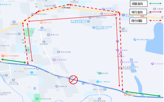 全封閉施工期間(2023年6月底至2023年8月底)往返繞行五一路、月亮湖路、江山路。